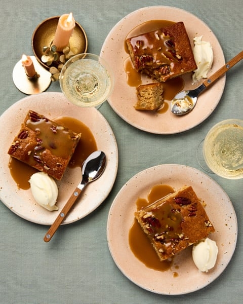 9. Cut the warm pudding into squares. Serve drenched with the hot caramel sauce and a spoonful of cold crème fraîche or ice cream.